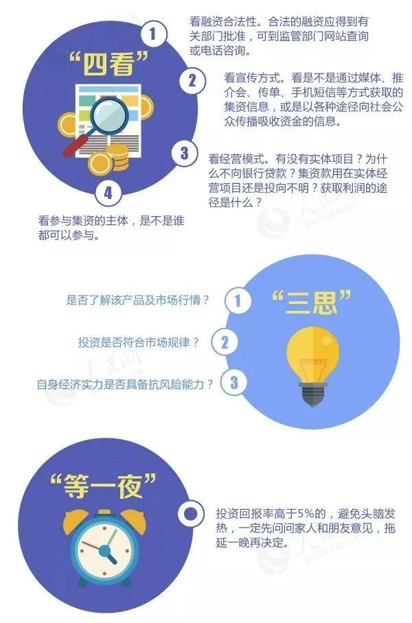 遇到投資集資類宣傳,一定要避免頭腦發(fā)熱,先征求家人和朋友意見,拖延一晚再決定,不要被高利誘惑盲目投資。