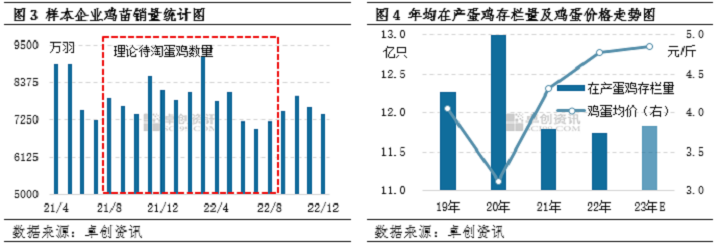 根據(jù)當前存欄基數(shù)、補欄量以及補欄心態(tài)預判,預計2023年產(chǎn)蛋雞理論存欄量同比增加0.85%,蛋供應較2022年略寬松,但仍低于正常水平(12億只)。