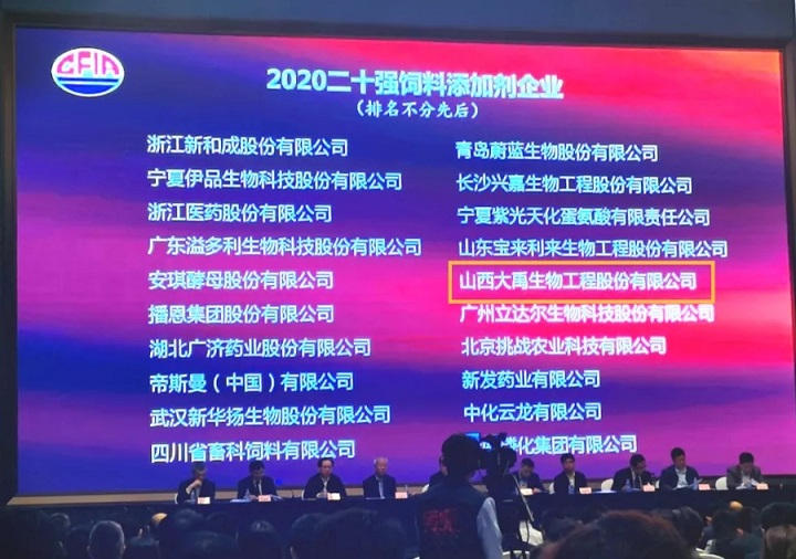 山西大禹生物工程股份有限公司獲評“2020二十強飼料添加劑企業(yè)”榮譽稱號,并受到農(nóng)業(yè)農(nóng)村部領(lǐng)導高度評價。